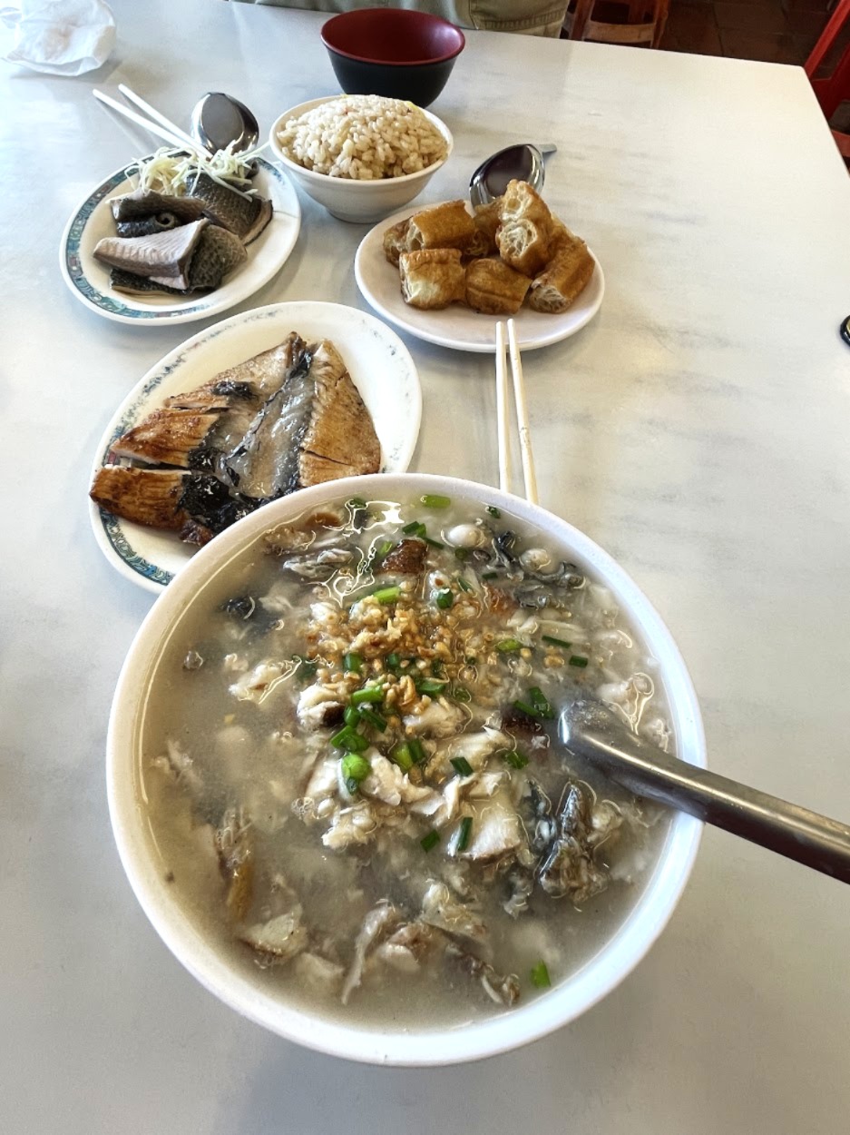 阿堂鹹粥: 煎虱目魚肚 (pan-fried milkfish belly).