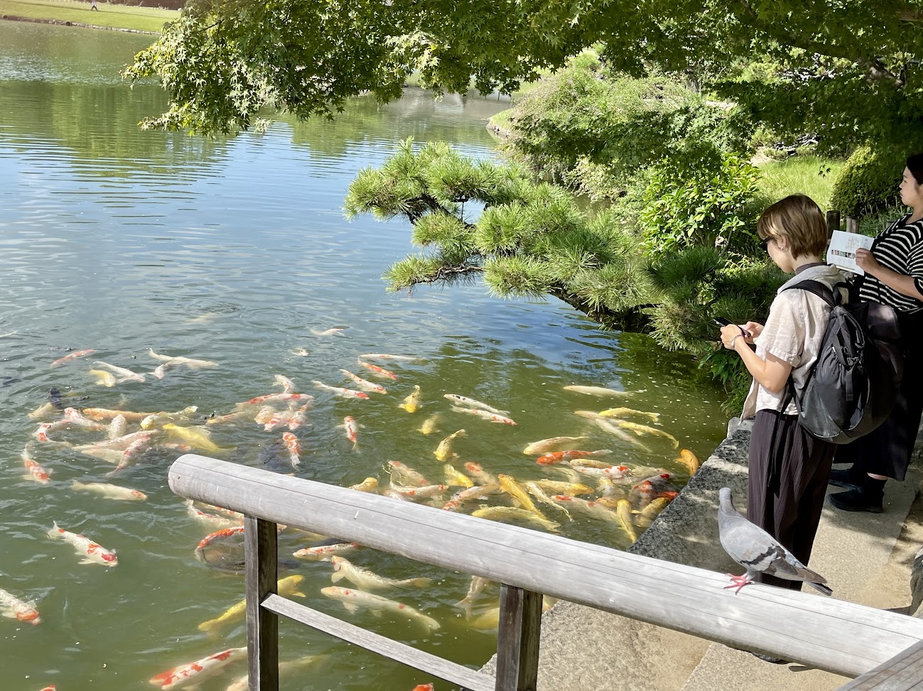 Beyond the trees in the background, the top of Okayama Castle was visible (underneath the frame of the torii gate.)