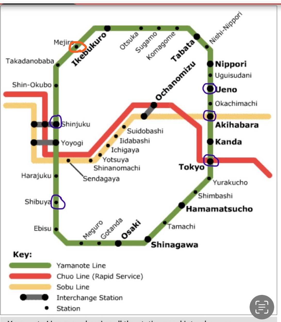 To Ikebukuro (at the 11 o'clock position), we relied on connecting to the looping green Yamanote Line.
