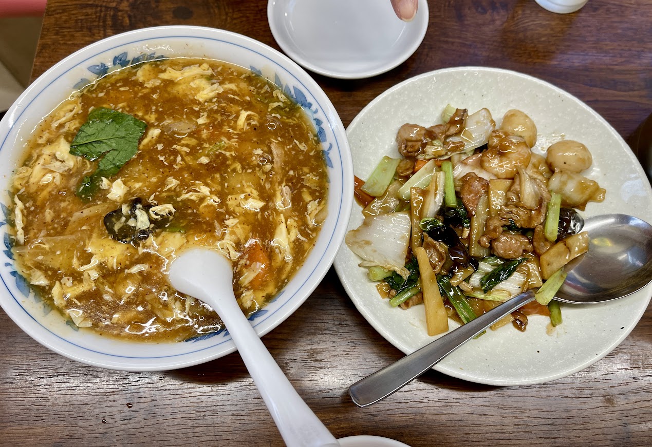 The stir-fried vegetable was sizzling hot and delicious, while the soup noodle was too spicy.
