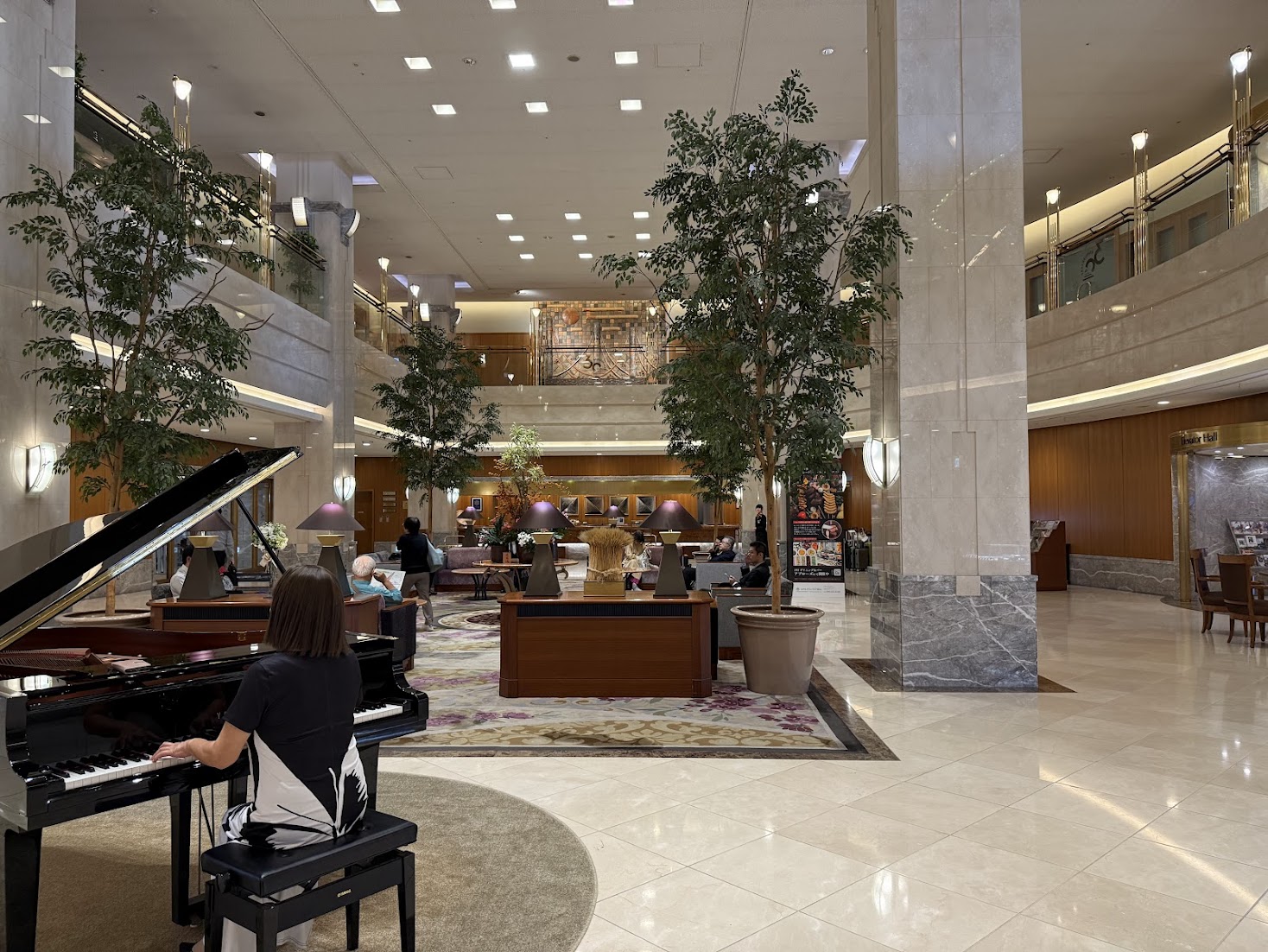 A female pianist plays popular songs in the hotel lobby during lunch hour.