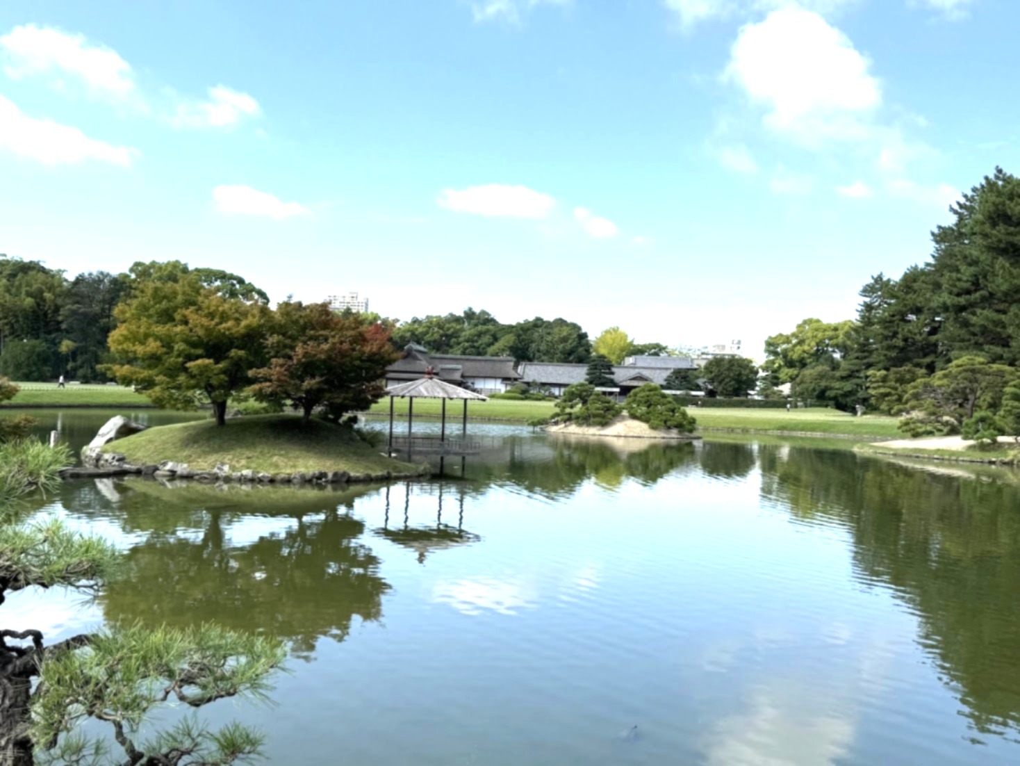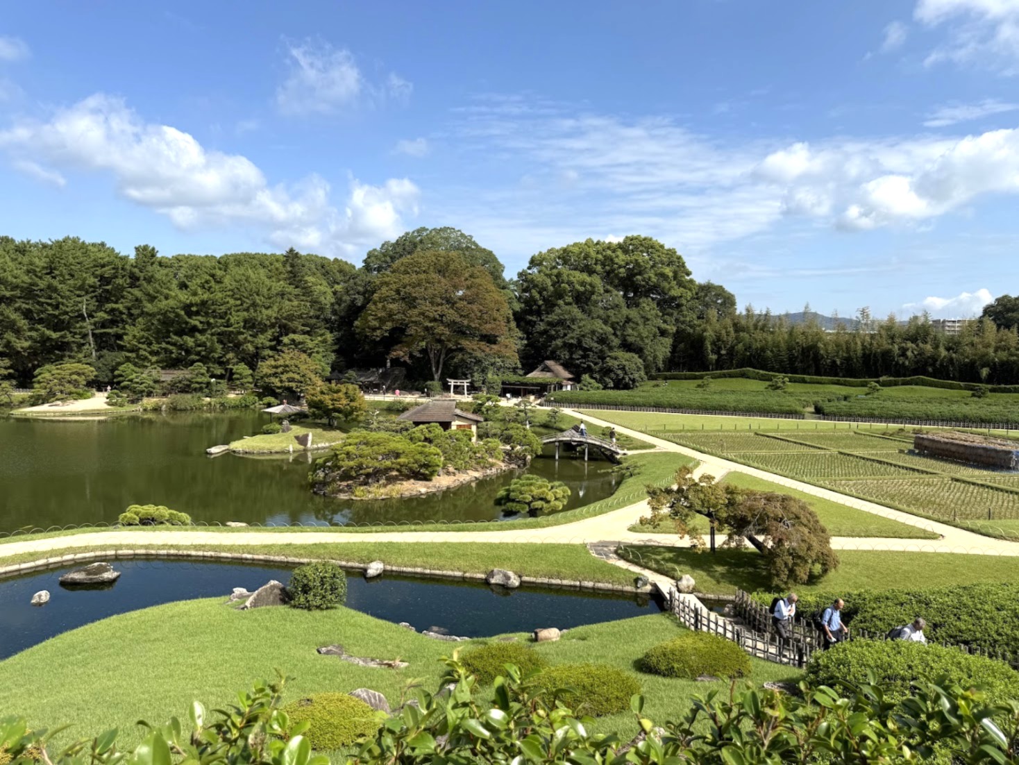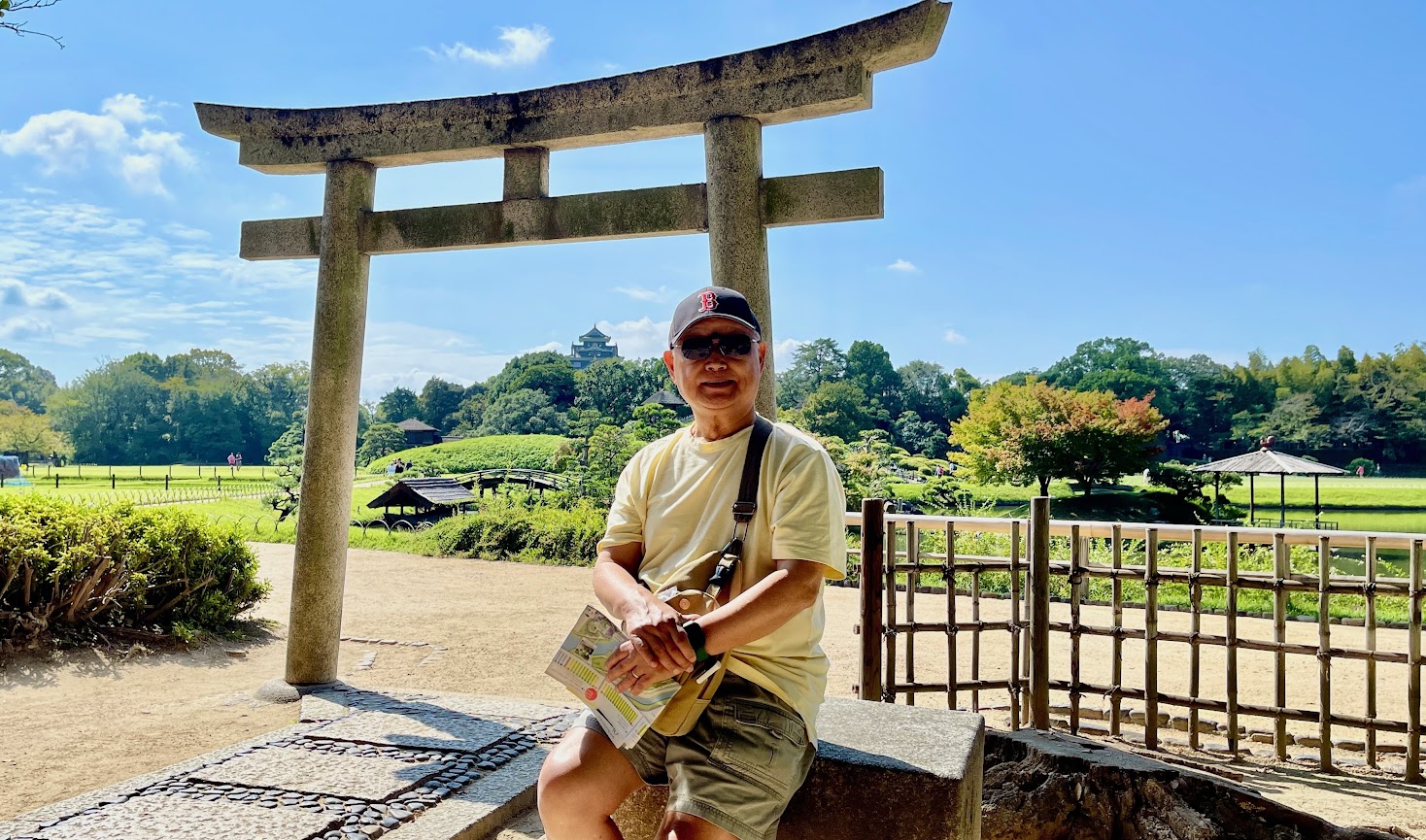 Beyond the trees in the background, the top of Okayama Castle was visible (underneath the frame of the torii gate.)