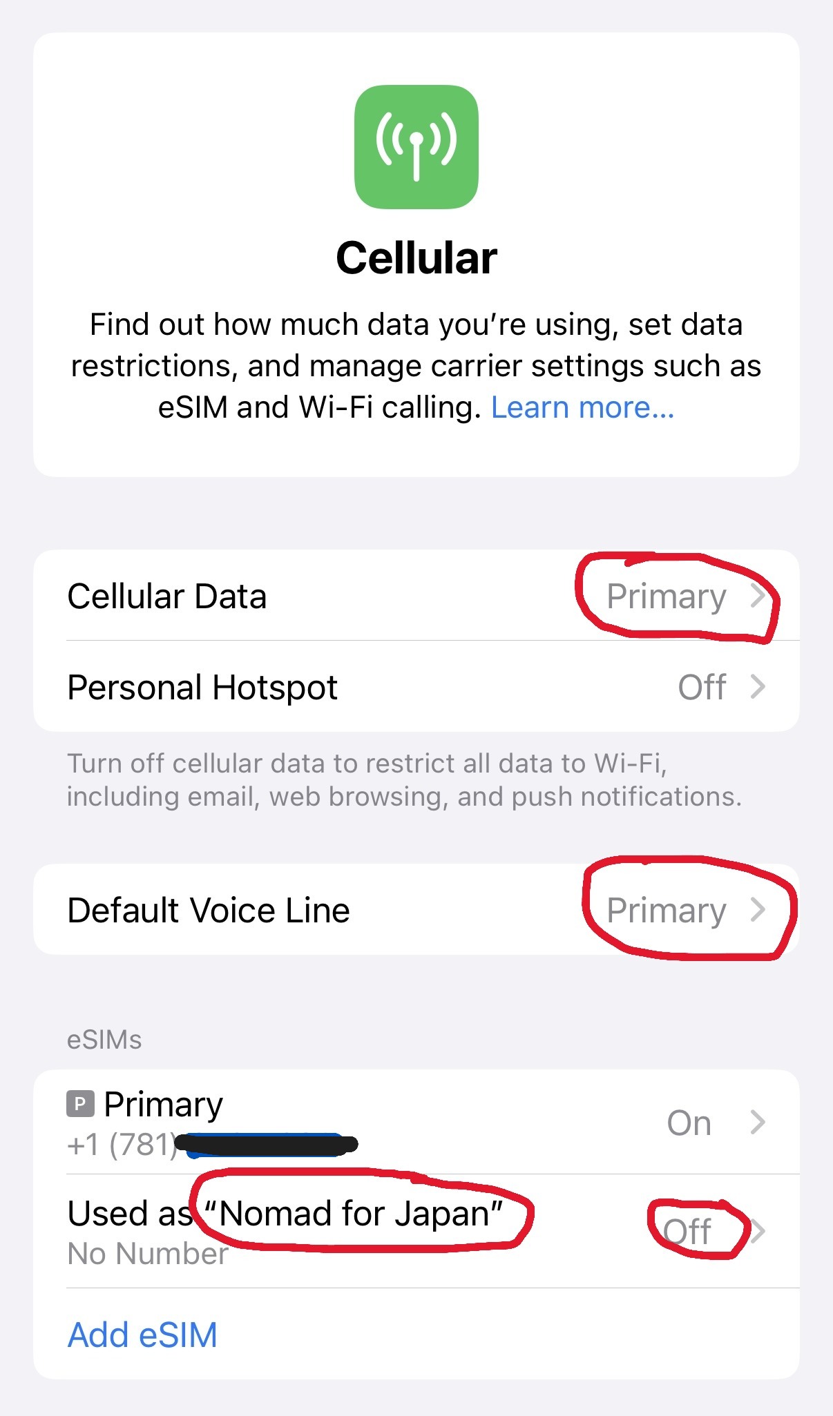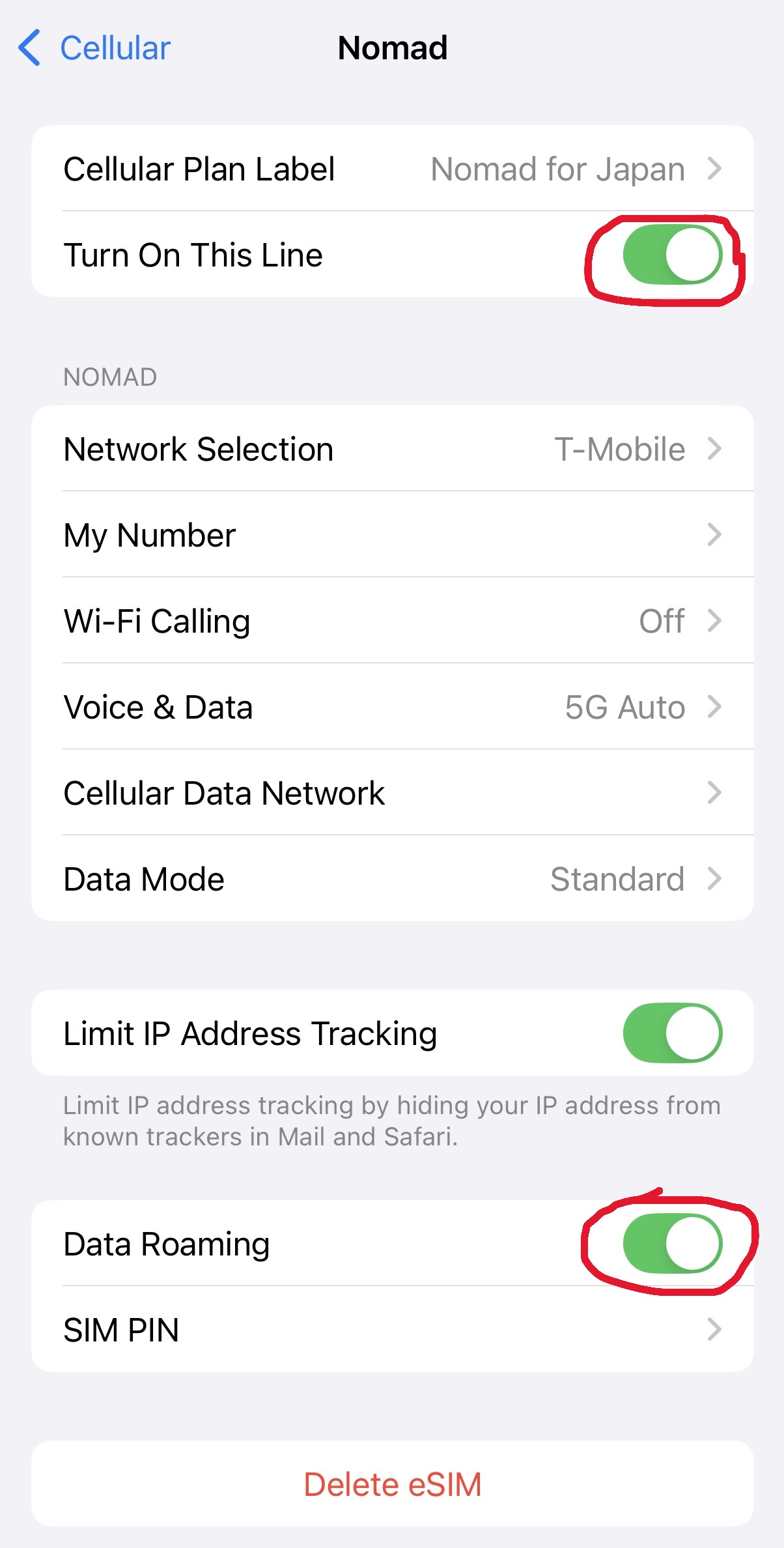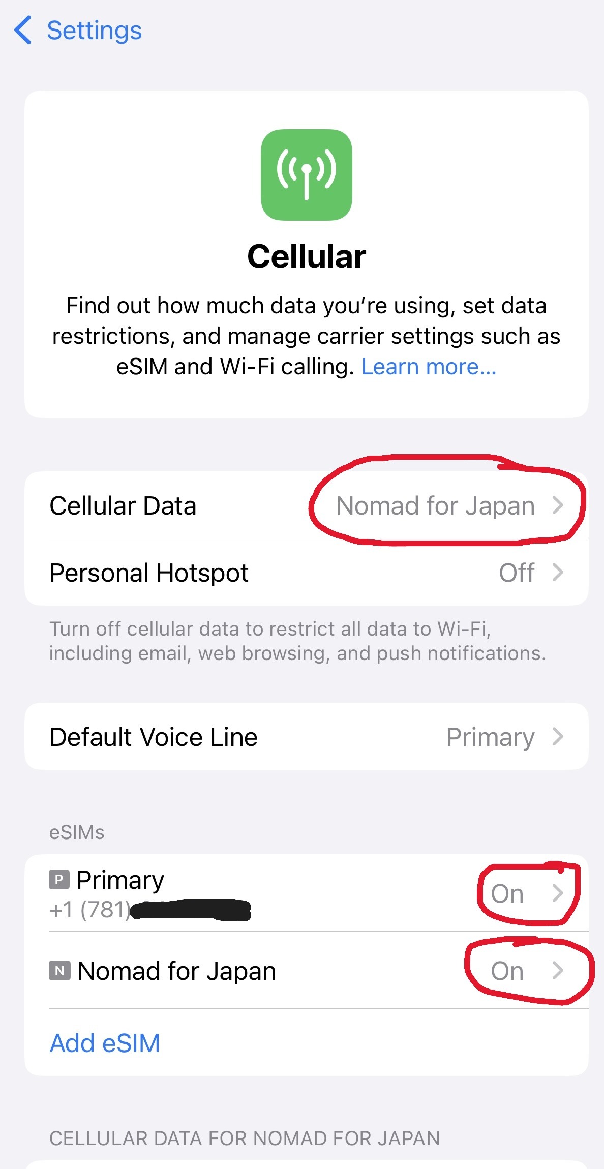 In Settings > Cellular > tap the name of your travel eSIM to Turn ON