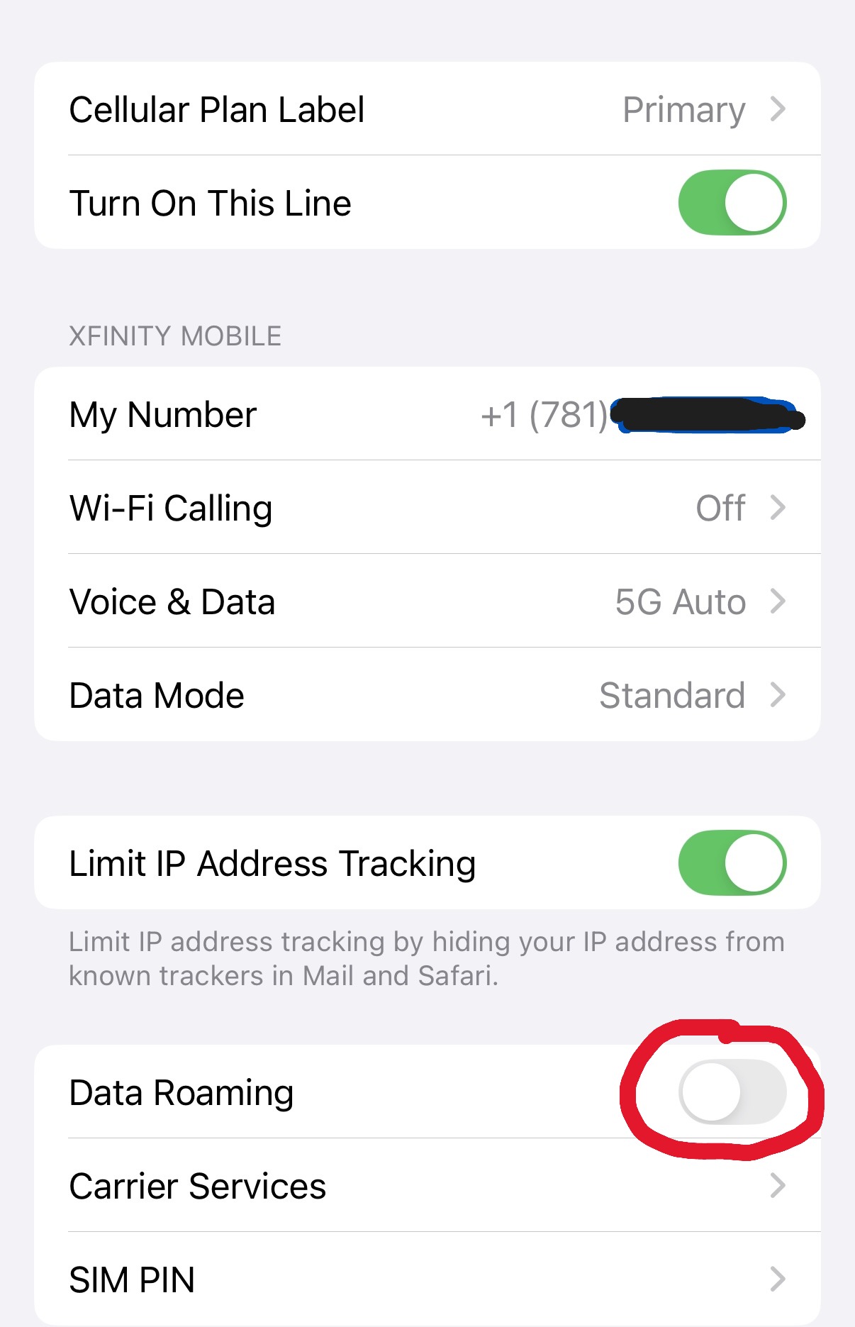 In Settings > Cellular > Primary, verify that the Data Roaming is OFF (not in green) for your Primary eSIM. It should remain OFF all the time.