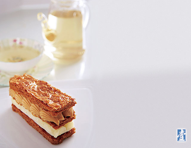 招牌甜點是現點現作的「焦糖蘋果千層酥」,層次分明、麵皮酥脆的千層酥最少要二天才能完成,上層是有著如濃郁牛奶糖香氣的焦糖卡士達,下層是軟透的蘋果丁,叉子切下去瞬間的流洩快感,視覺與味覺都得到滿足。造型簡單又具設計感、以白巧克力與馬茲卡朋起士為主體的「卡蜜拉」,同樣受到年輕族群喜愛。