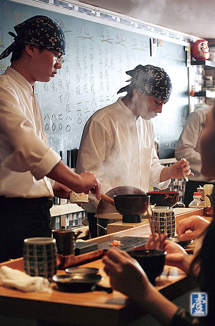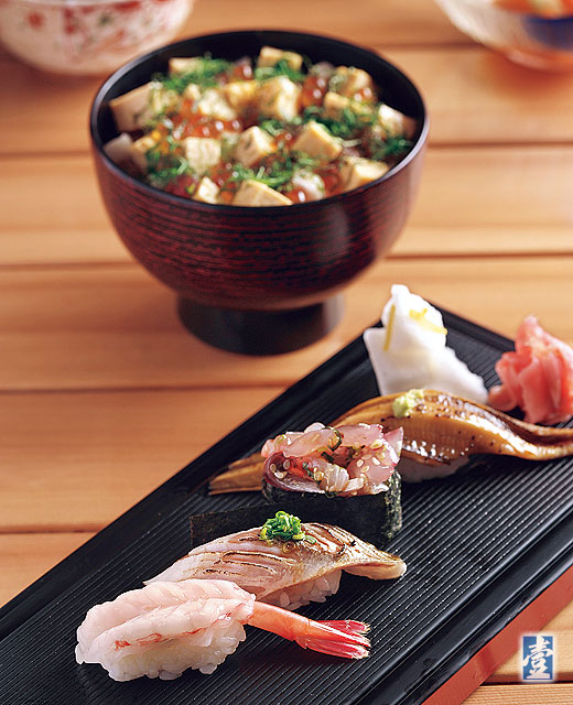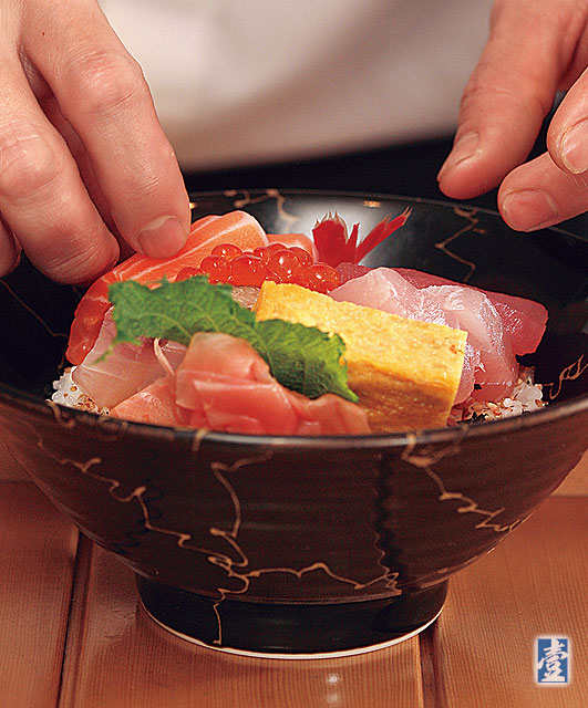 店裡晚上以「お任かせ(Omakase)」(師傅配菜)為主,另外有單點的丼飯供應,其中以「海鮮丼」最叫座,碗面上鋪上四種魚、甜蝦與鮭魚卵、玉子燒,十幾塊魚肉鋪滿碗面的場面甚是壯觀。料理長曾在「東丸壽司」工作,捏製壽司與選料有一定水準,師傅喜歡配上一點自己的創意,例如單點的「比目魚緣側」握壽司,就點上明太子豐富層次與變化,入口還能嘗到米飯的微溫,吧台上客人與師傅互動相當熱鬧,加上中價位的消費,讓許多年輕人一試成主顧。