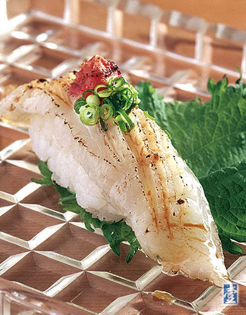 入口即化的「比目魚緣側」表面微炙,點上明太子與蝦夷蔥增加豐富度。(80元╱個)